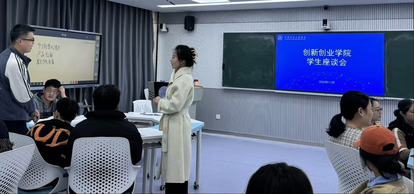 11月12日下午,创新创业学院在7号楼203教室召开学生座谈会,本次会议由创新创业学院教研室主任薛凯琳主持,创新创业学院教学秘书卢润、教师代表和三十余名学生代表参加座谈会。